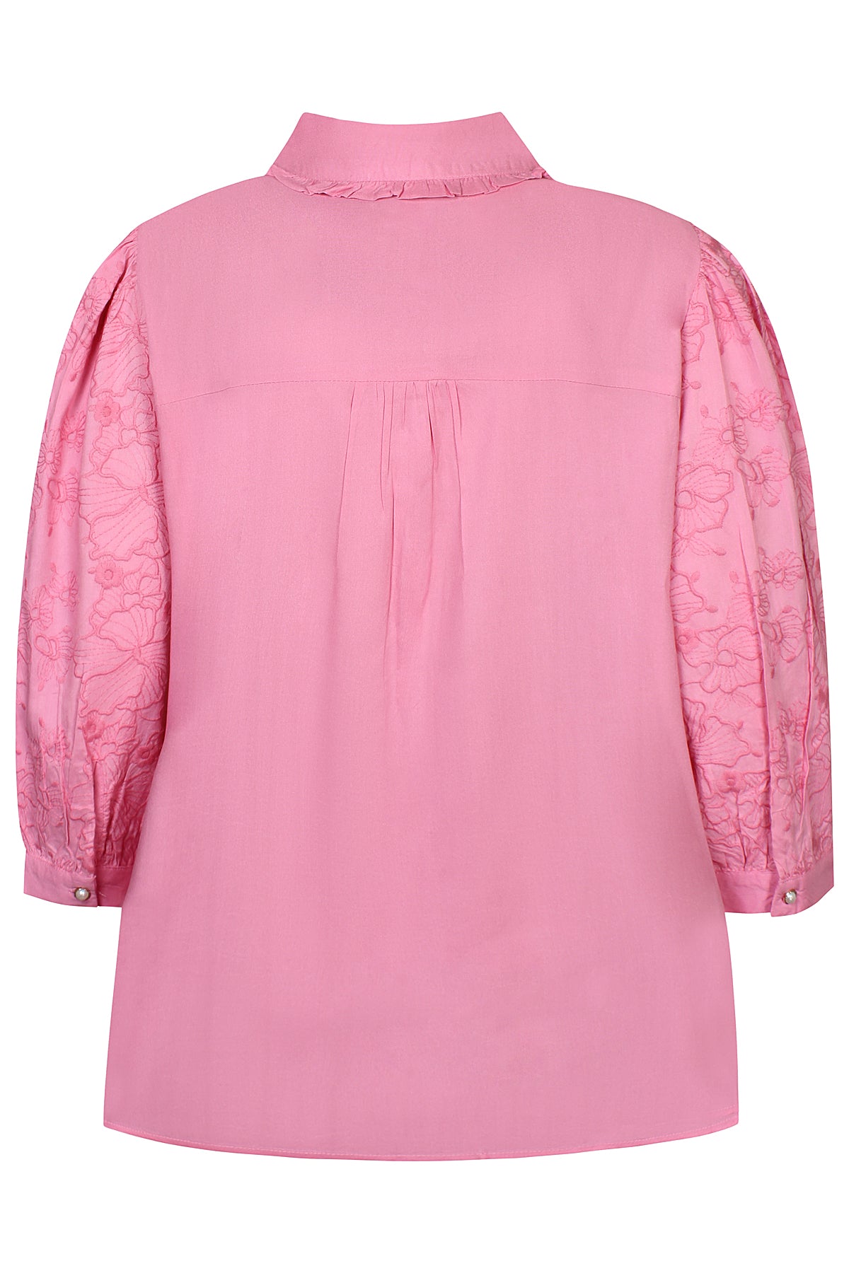Denne skjorte forener elegance og komfort med sin lethed og dekorative detaljer. Ærmerne er prydet med smukt broderi, og de små perleknapper foran giver et feminint løft. Flæsedetaljen ved kraven og de fine rynker ved skuldrene tilfører ekstra karakter, uden at gå på kompromis med det stilrene udtryk. En ideel style til både kontor og afslappede hverdage.