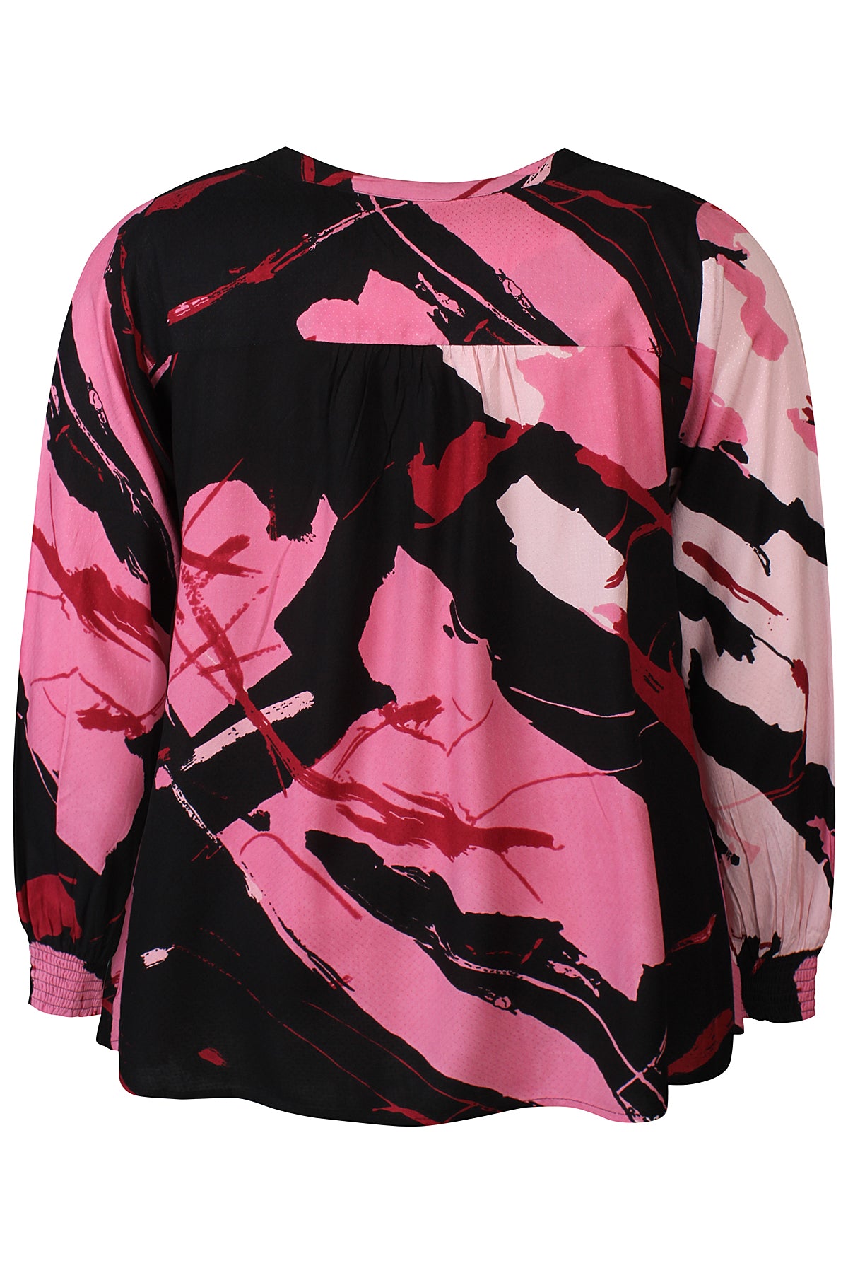 ANITY 1205 er en stilfuld bluse i blød viskose med et kunstnerisk print og diskrete shiny dots, der fanger lyset på en elegant måde. Modellen har en feminin V-udskæring, smockdetaljer foran og ved ærmerne, som både tilføjer struktur og giver en behagelig pasform.