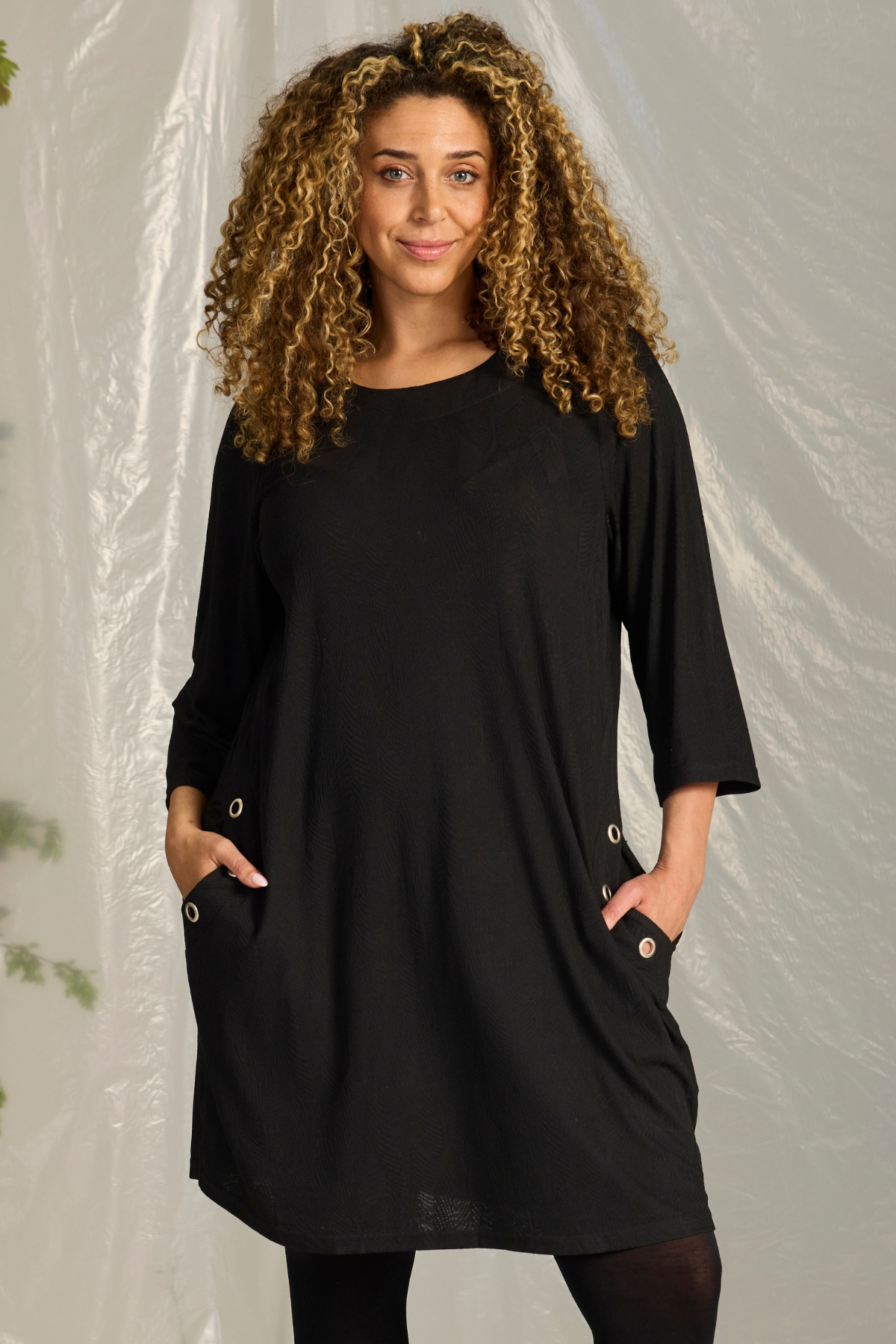 HELENA 1325 er en stilren tunikakjole i en blød jacquardvævet kvalitet med viskoseblanding, der føles behagelig og ser elegant ud. Modellen har 3/4-ærmer og dekorative metalindrammede huller ved lommerne, som giver et moderne twist til det klassiske snit.